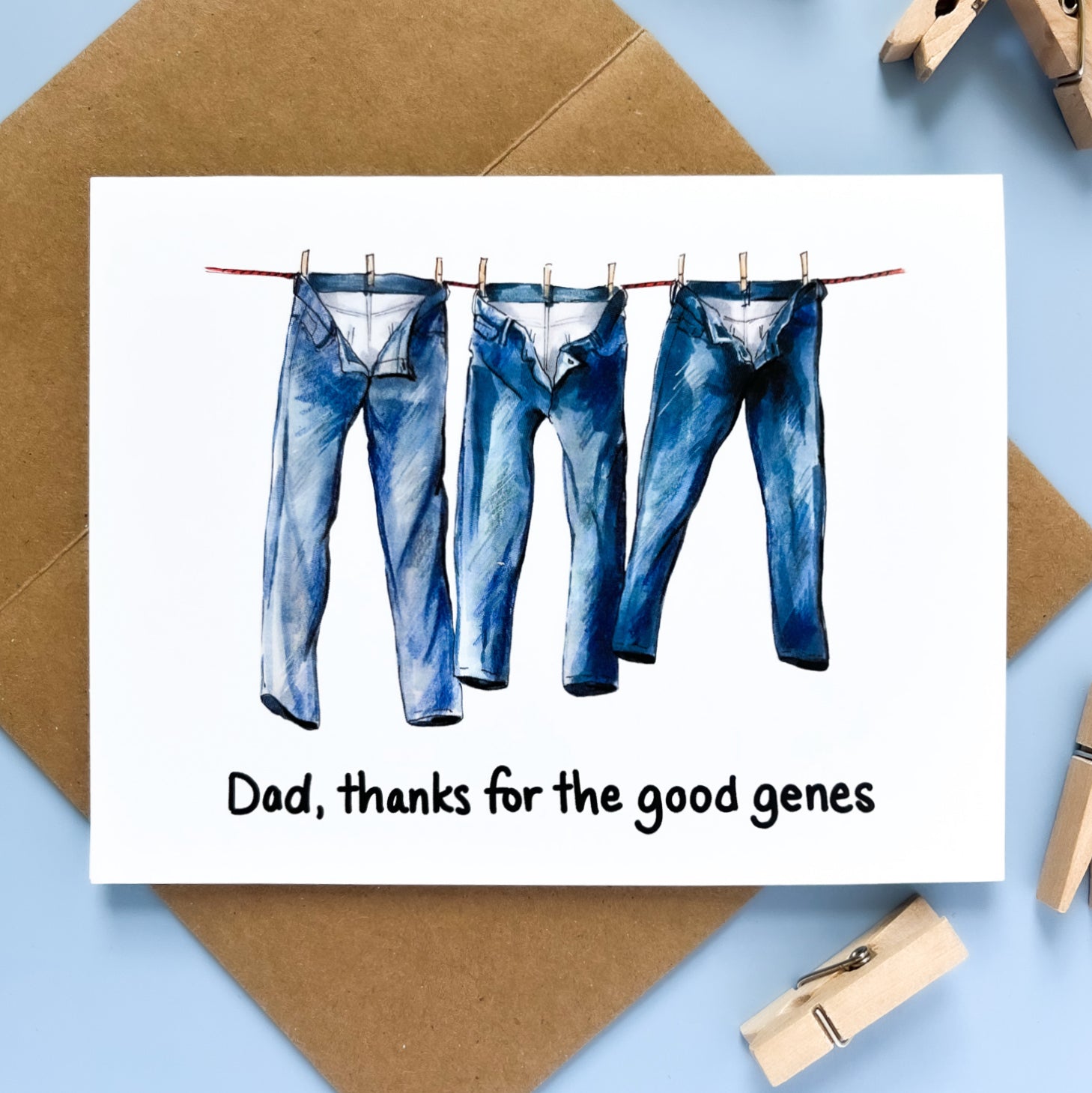 A punny Father's Day card for the dad who passed down some seriously great genes! Featuring a watercolor illustration of blue jeans on a clothesline, this witty card is sure to get a laugh. Perfect for Father's Day, birthdays, or just because! Give Dad a chuckle—add to cart now!