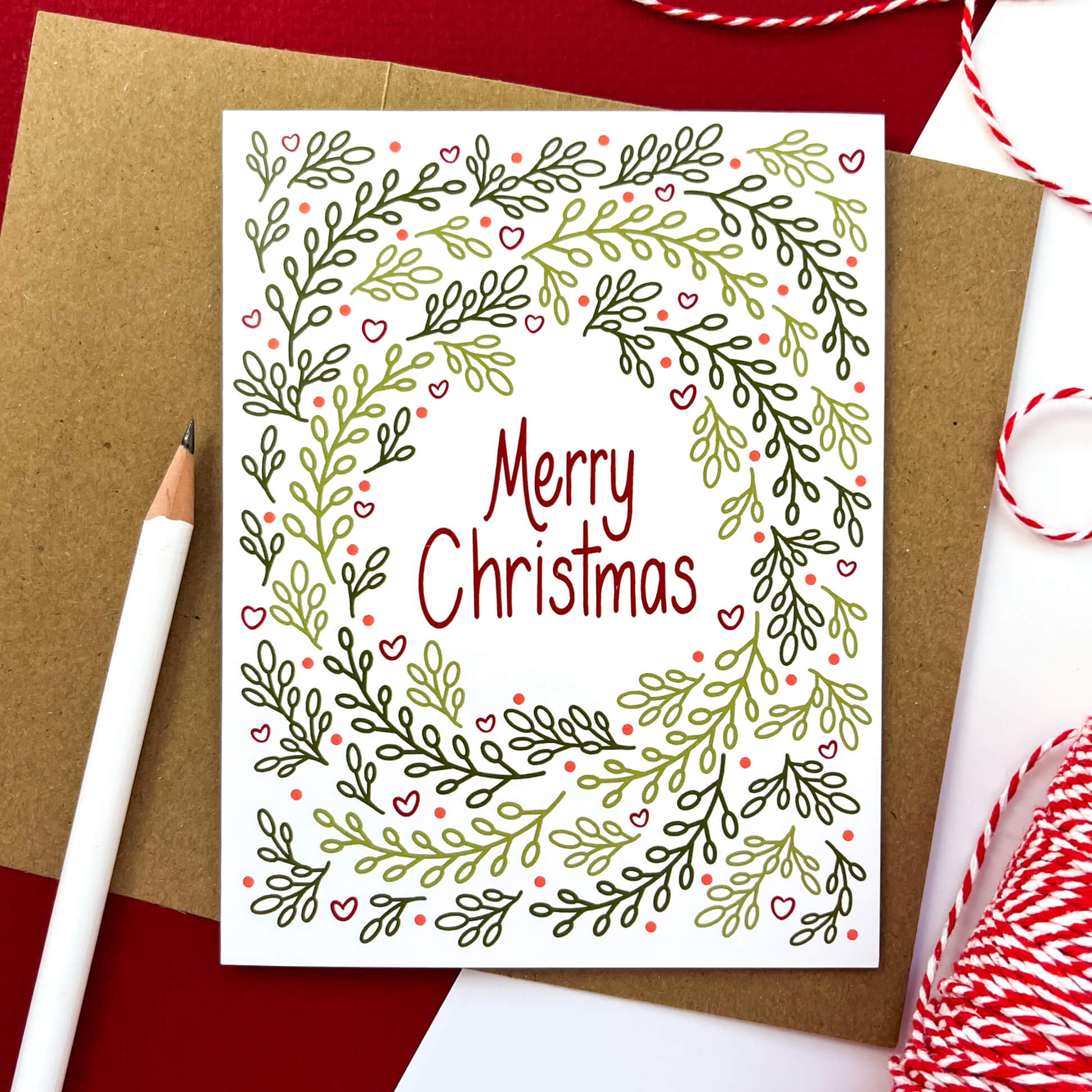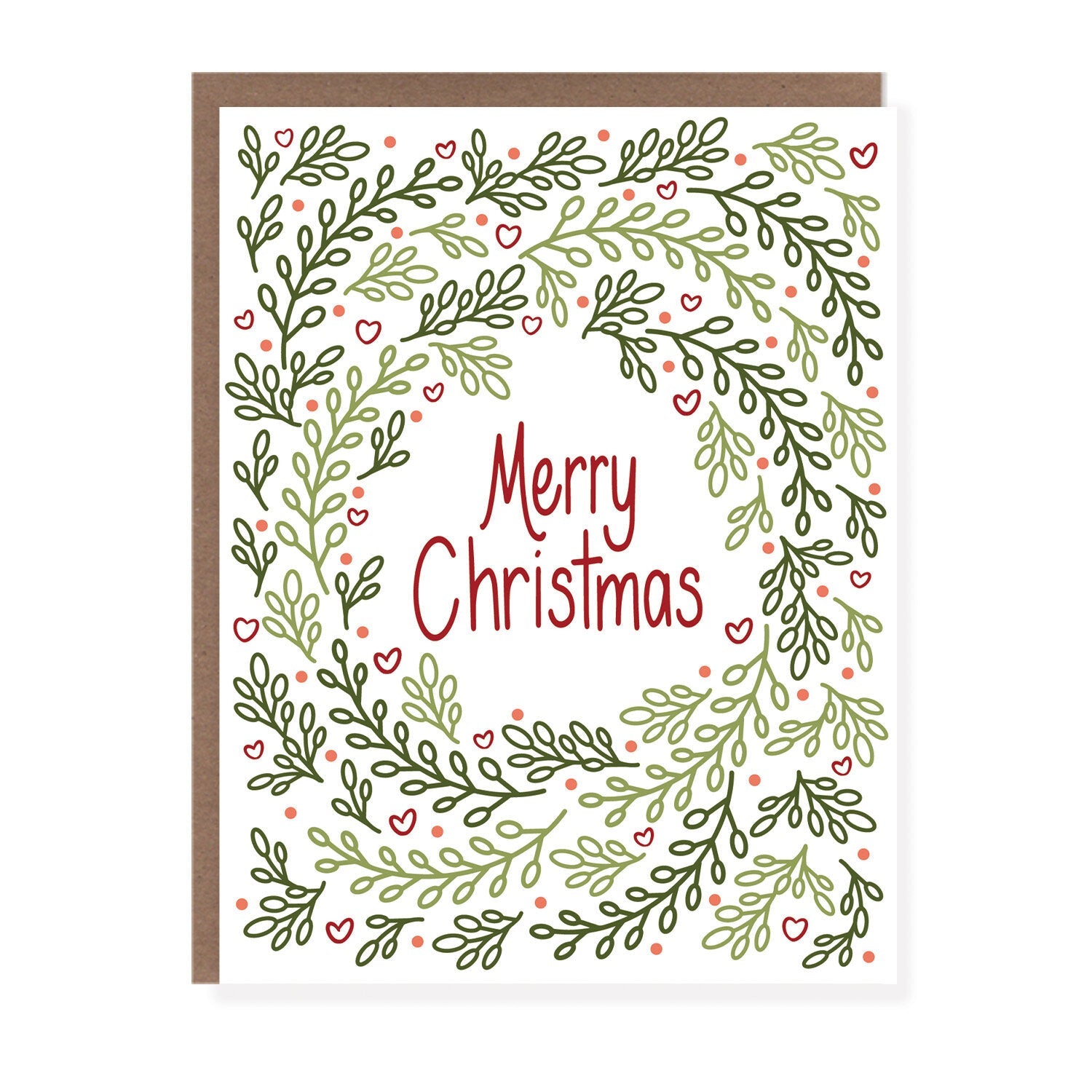 This folk inspired design is an updated take on a Christmas wreath. Interspersed with the berries are tiny hearts to send love to friends and family! This box gives you 8 cards to send to friends and family.