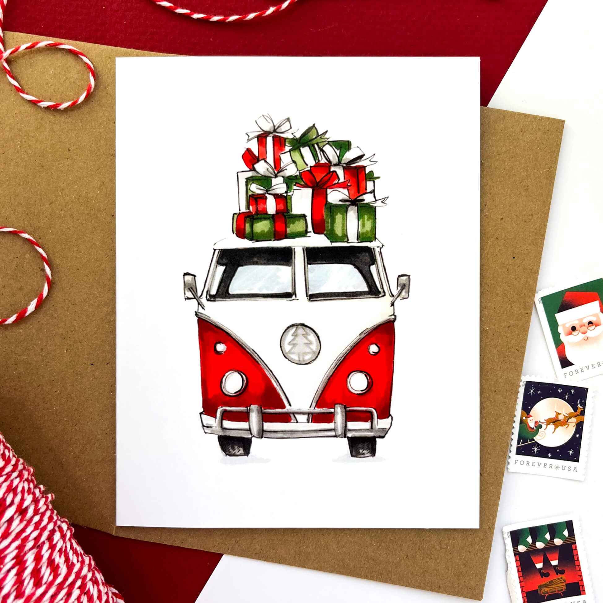 Celebrate the holidays with this classic car design. This box gives you 8 cards to send to friends and family.