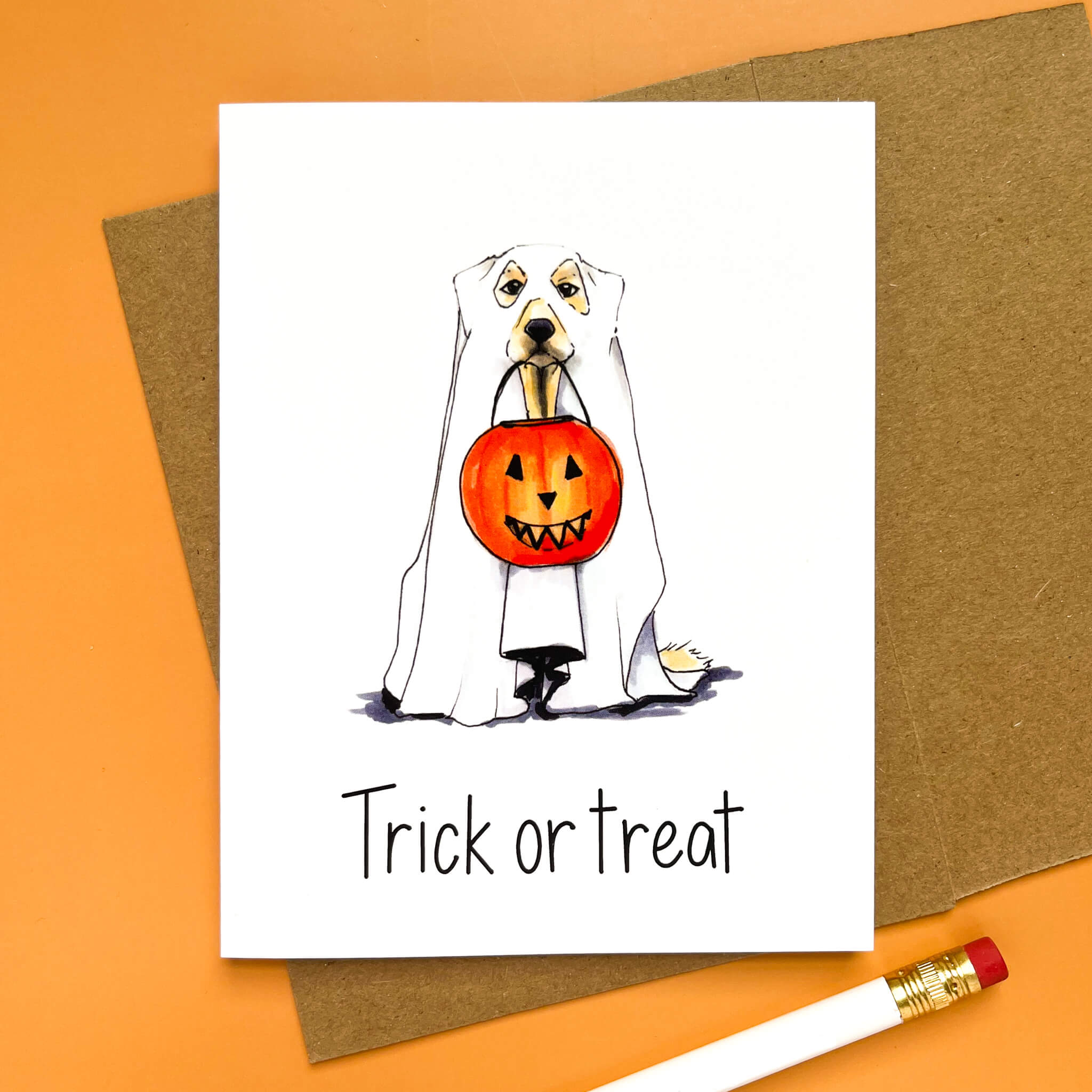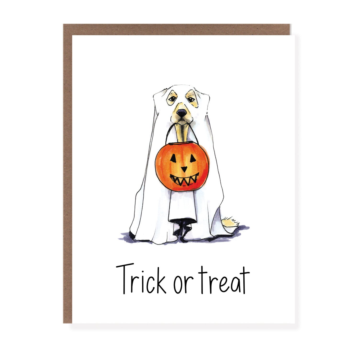 An adorable Golden Retriever in a sheet holding a pumpkin candy bucket! This box gives you 8 cards to send to friends and family.