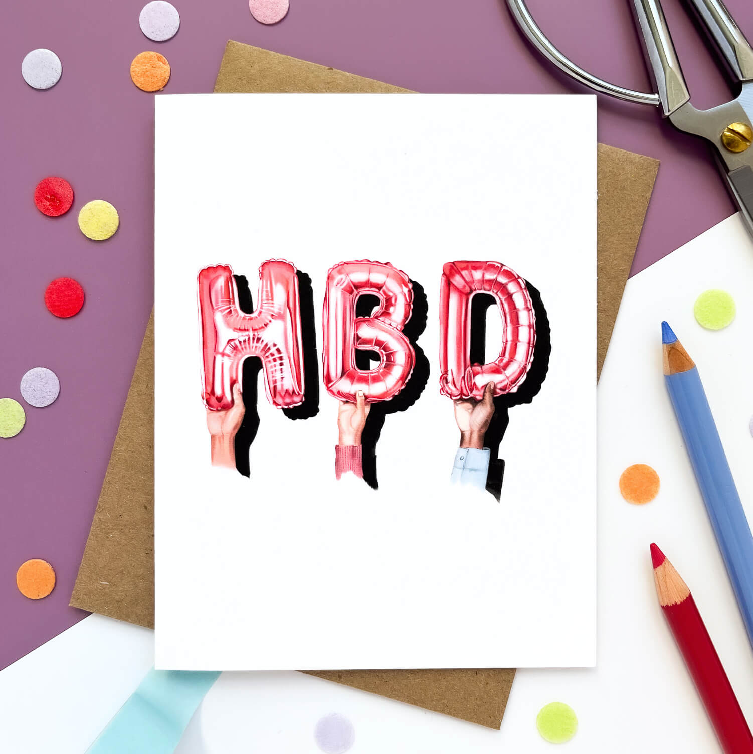 Say "Happy Birthday" in style with this trendy HBD balloon card. Featuring three hands holding shiny pink foil balloon letters spelling "HBD," this modern and vibrant design is perfect for birthdays of all ages. Whether you're celebrating a best friend, sibling, or coworker, this stylish and fun card makes the perfect addition to any birthday gift. Made with sustainable materials, it’s a great choice for those who appreciate unique and eco-conscious stationery.