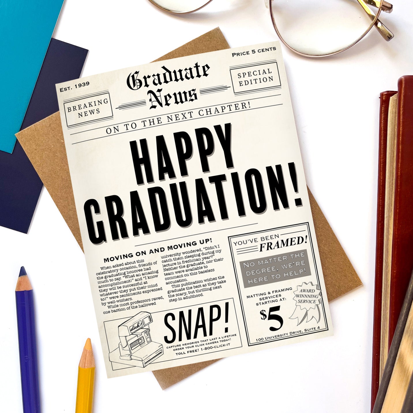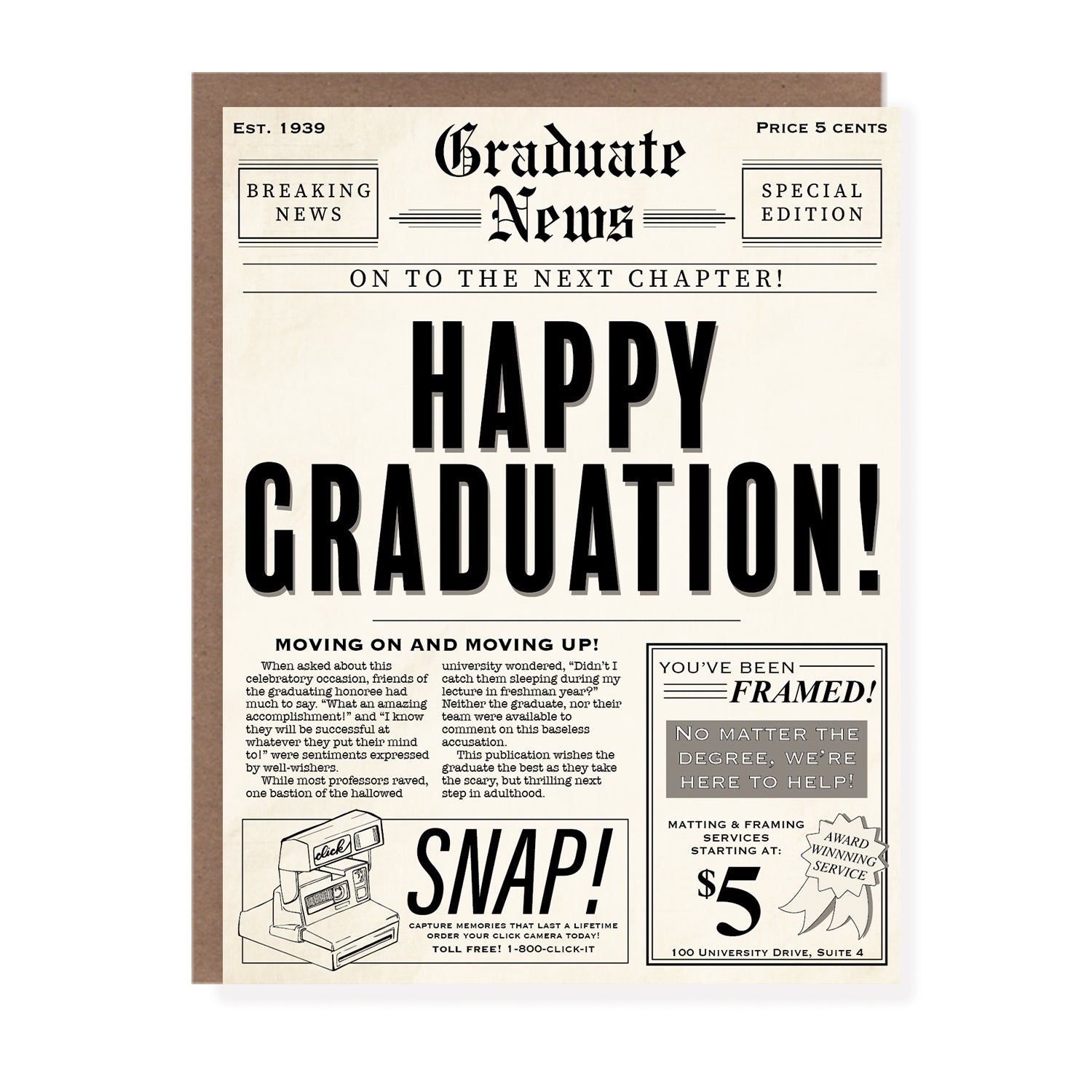 Celebrate the grad who’s ready to take on the world with this vintage newspaper-inspired graduation card! Packed with fun 'easter eggs' that nod to the adventures, challenges, and triumphs of the journey ahead, this card brings a playful twist to the big milestone.
