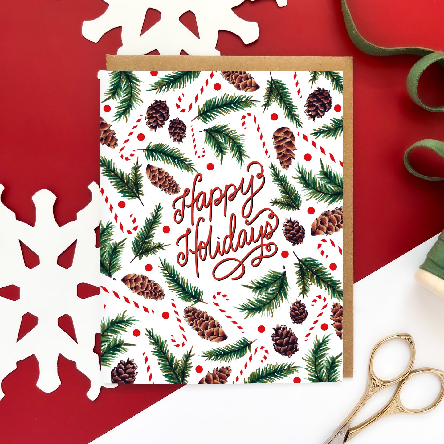 Wish friends and family a holly jolly festive season with my Holiday Scatter Print Card! Featuring a whimsical design of pine cones, pine needles, and candy canes, this card is sure to spread joy to all who receive it. Say goodbye to boring holiday cards and hello to festive fun!