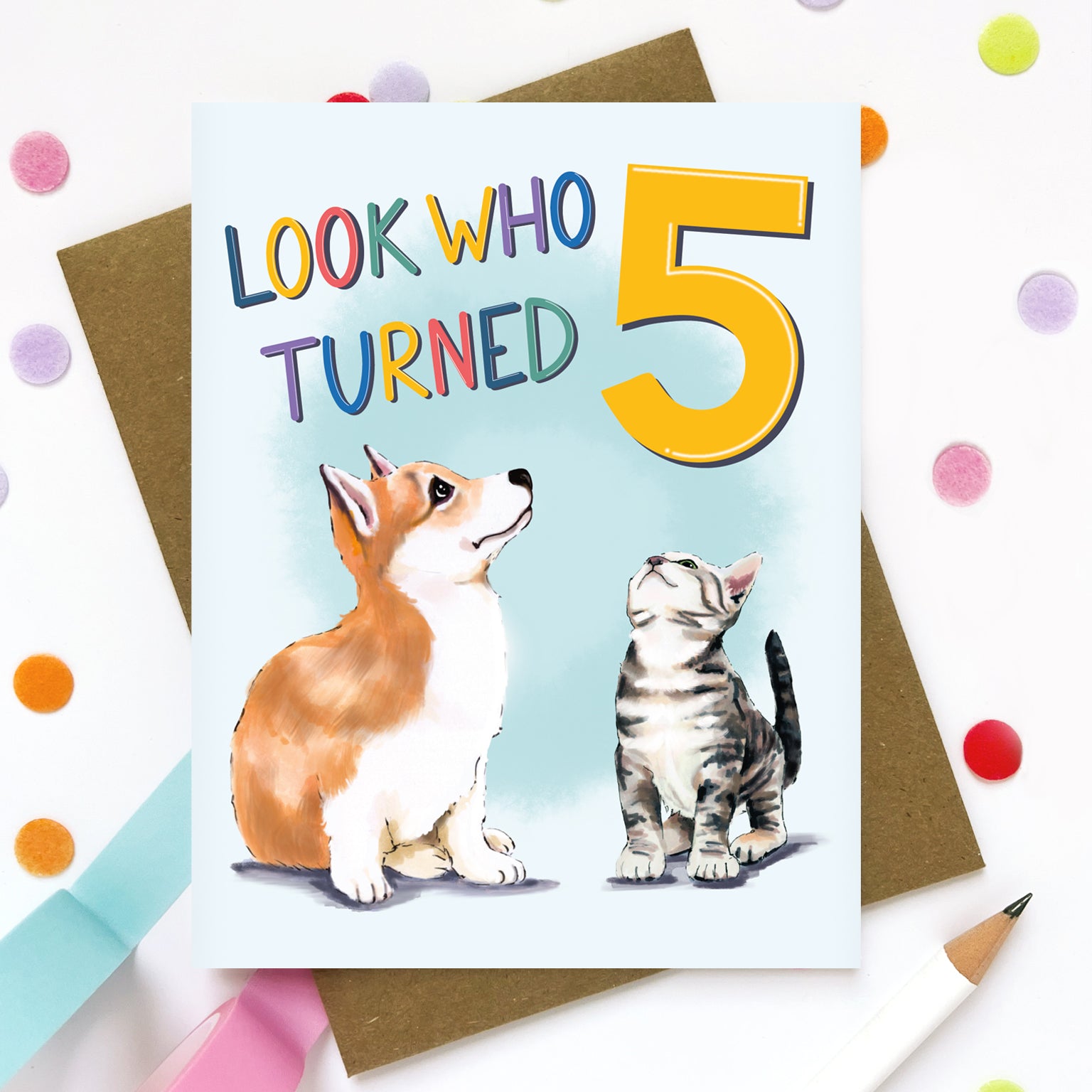 Celebrate a special fifth birthday with this adorable milestone greeting card featuring a cute corgi and kitty gazing up at a giant number 5. Perfect for marking a memorable occasion, this beautifully illustrated card captures the excitement of turning five. Ideal for any gender, this playful and heartwarming design makes a wonderful keepsake. The card is blank inside, ready for your personalized birthday message. This is the perfect card for fifth birthday parties.