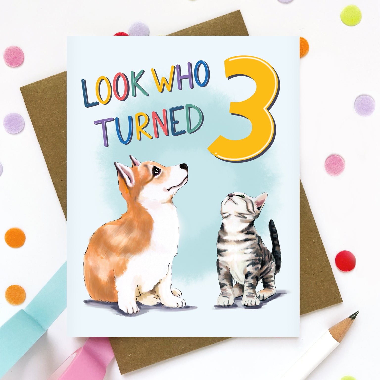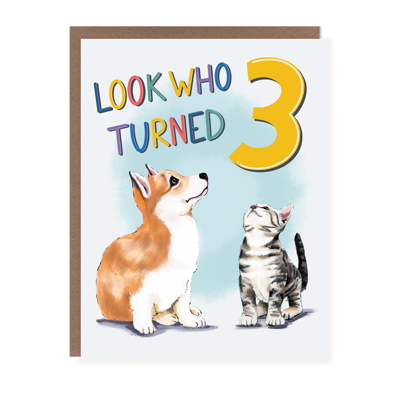 Celebrate a special third birthday with this adorable milestone greeting card featuring a cute corgi and kitty gazing up at a giant number 3. Perfect for marking a memorable occasion, this beautifully illustrated card captures the fun of turning three. Ideal for any gender, this playful and heartwarming design makes a wonderful keepsake. The card is blank inside, ready for your personalized birthday message. This is the perfect card for third birthday parties.