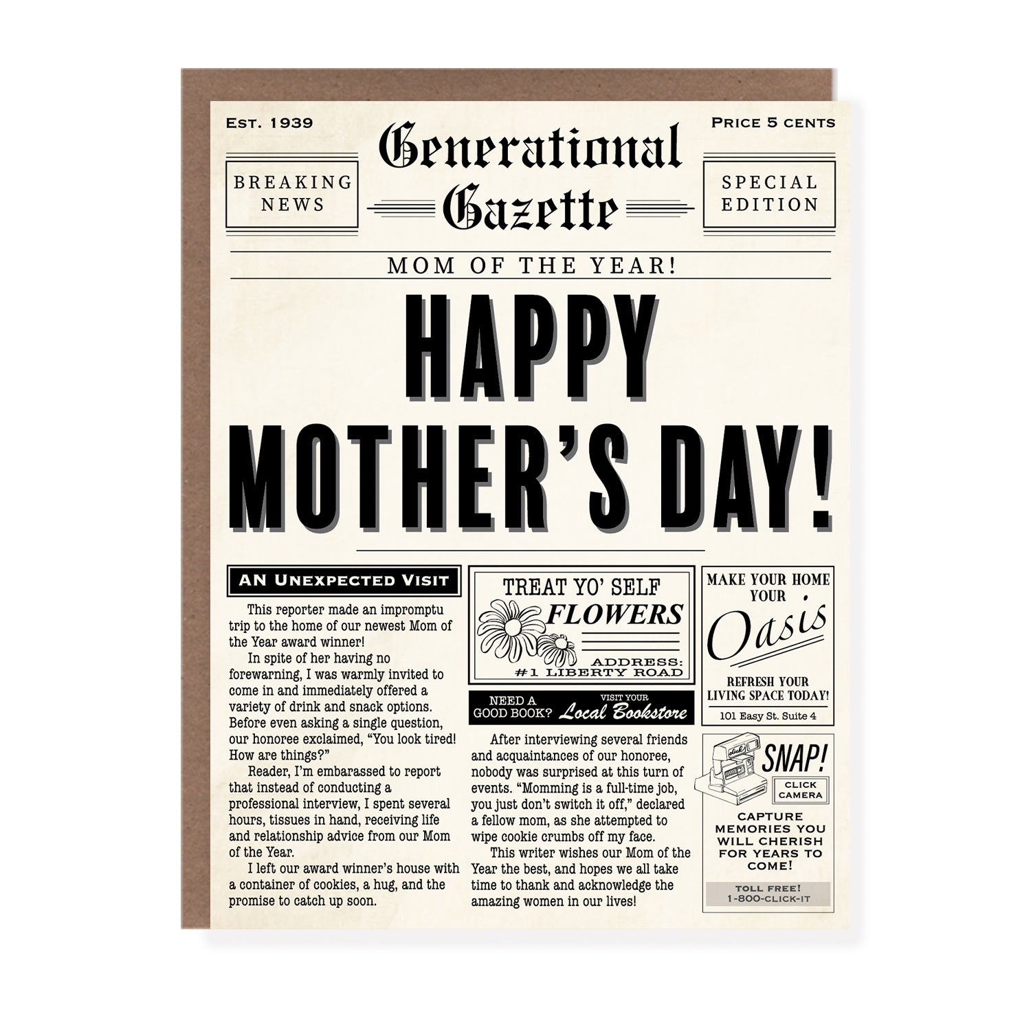 Give Mom a Mother's Day card as unique as she is! This vintage newspaper-inspired design is packed with playful 'easter eggs' that celebrate all the little things that make motherhood so special. From witty references to classic mom moments, this card is the perfect blend of nostalgia and humor. A charming, one-of-a-kind way to show Mom just how much she’s cherished!
