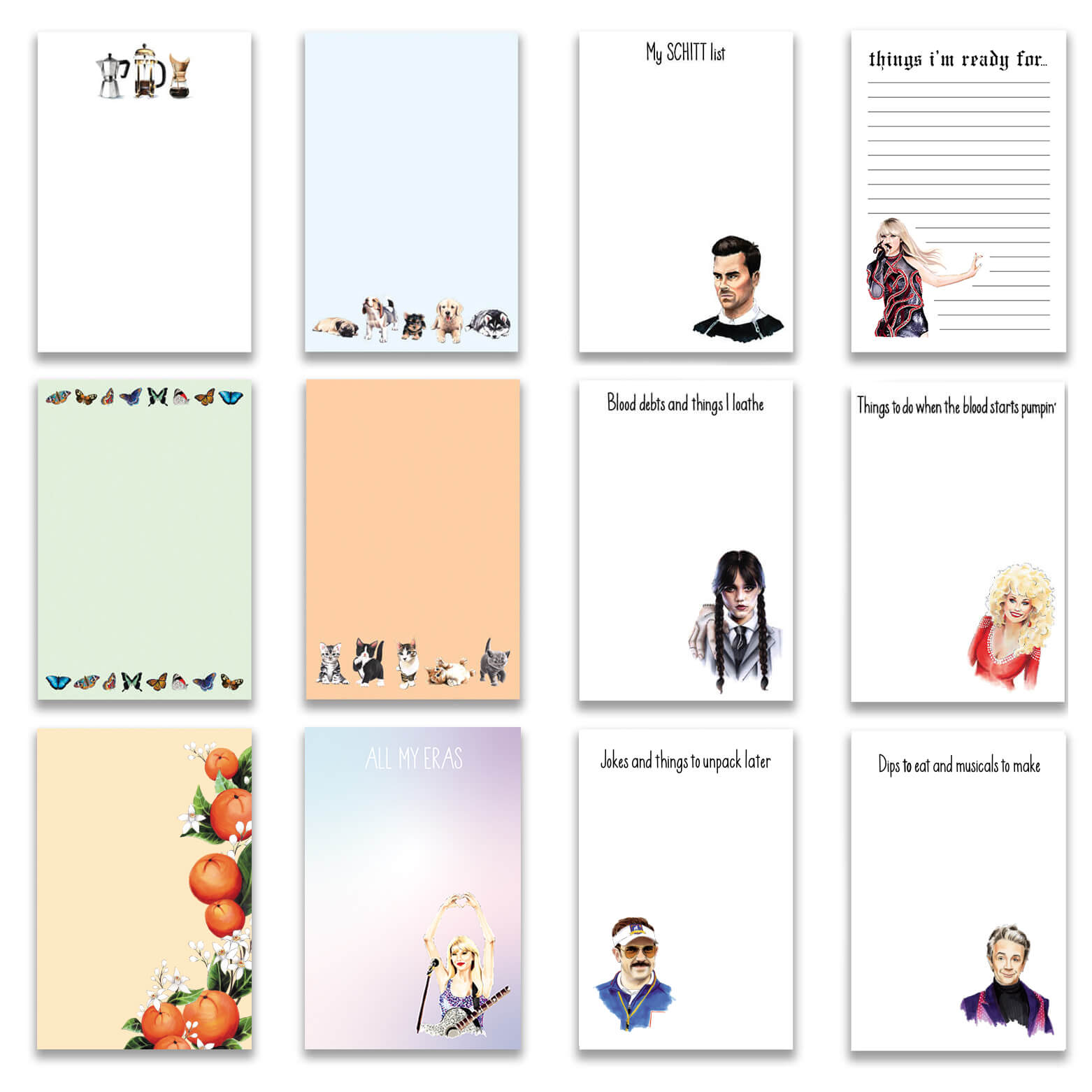 These notepads are just note quite up to standard - whether slightly dented backs, not quite perfect cuts, slight color discrepancies, or missing a page or two. All notepads are perfectly usable and the illustrations are my normal print quality!