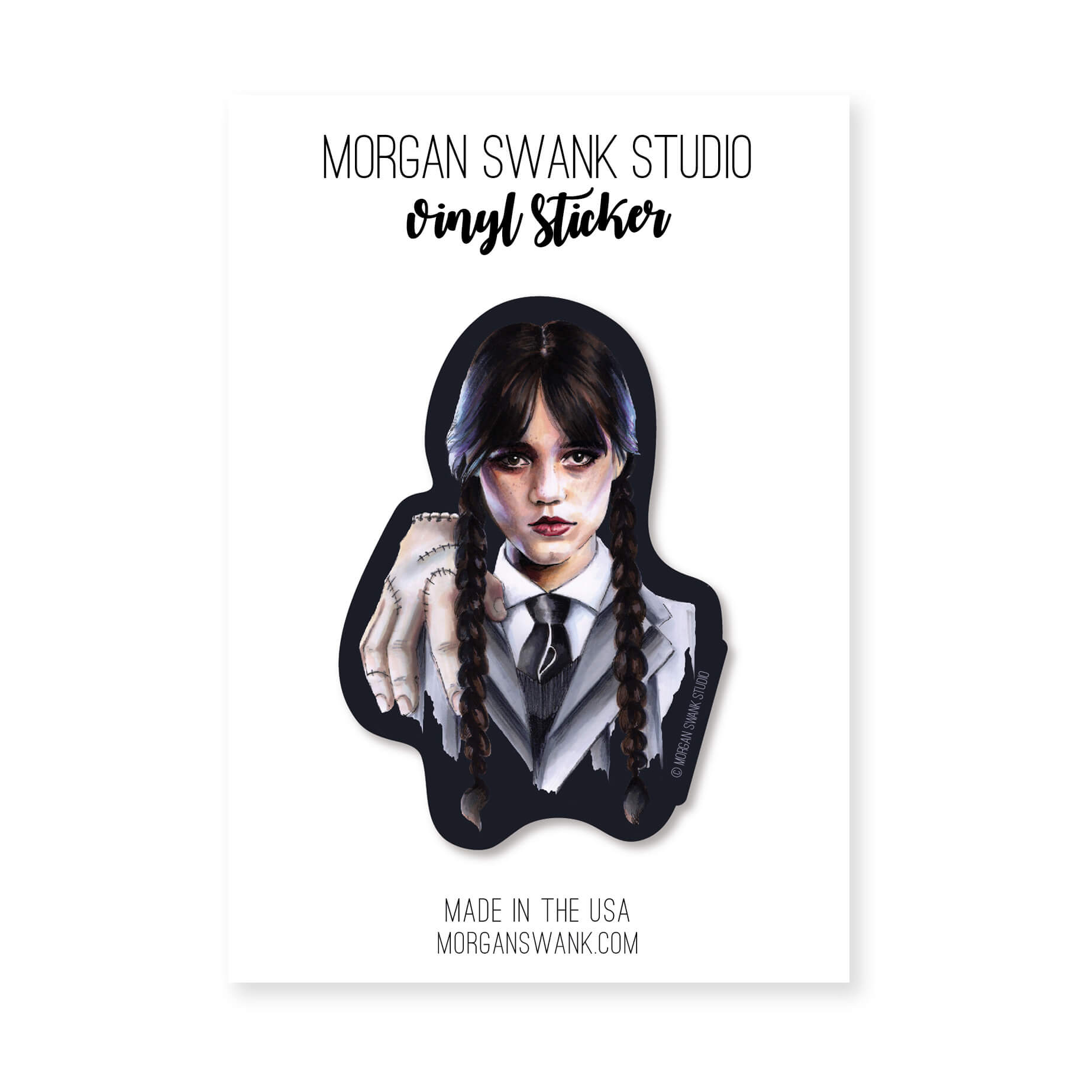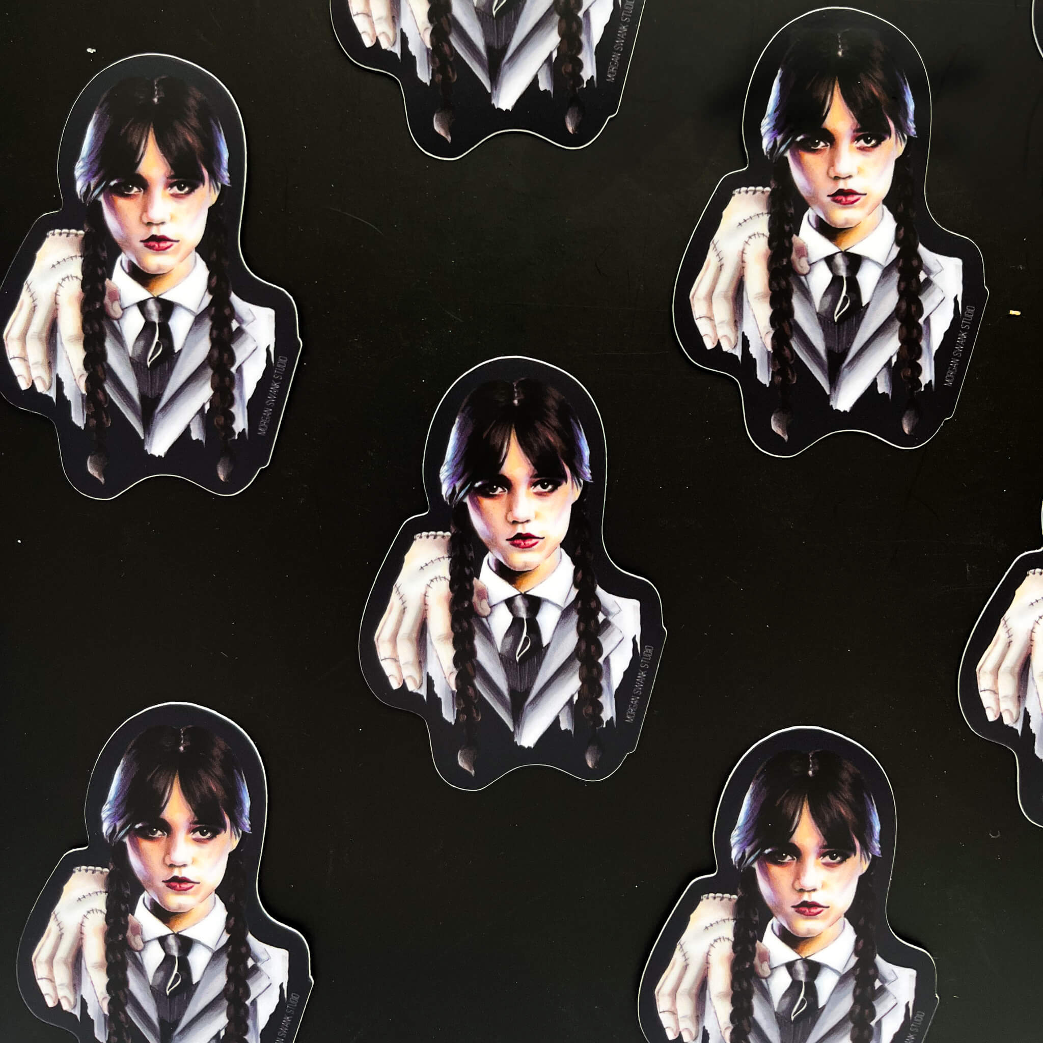 Add a touch of dark academia and gothic charm to your collection with this Wednesday Addams-inspired vinyl sticker! Featuring stunning hand-drawn artwork of Wednesday with her signature braids and an ominous presence of Thing, this sticker is perfect for fans of all things eerie and iconic. Stick it anywhere… if you dare.